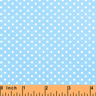 Light yellow knit ruffle shirt with large applique logo. Blue tiny polka dot knit shorts with light yellow ruffles.