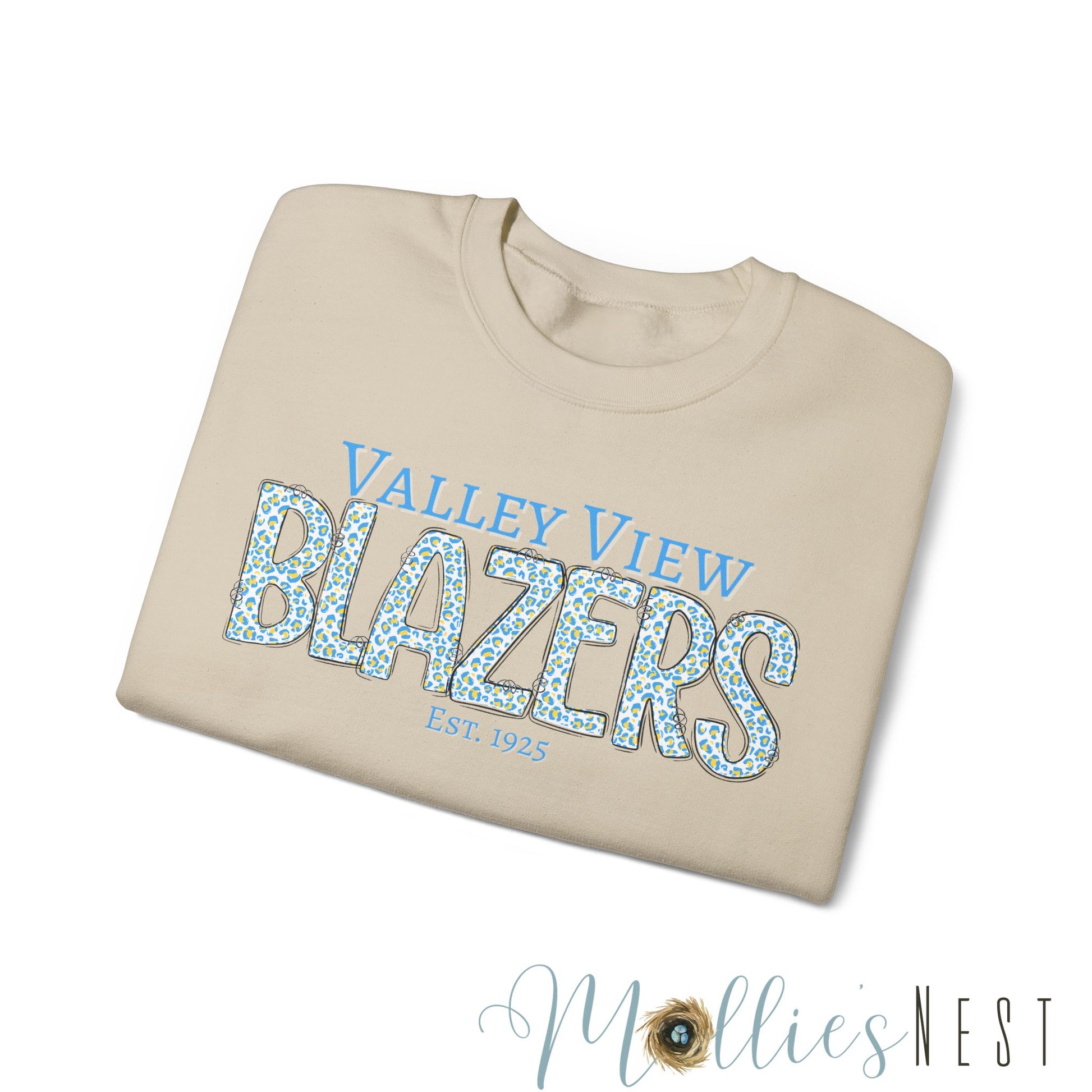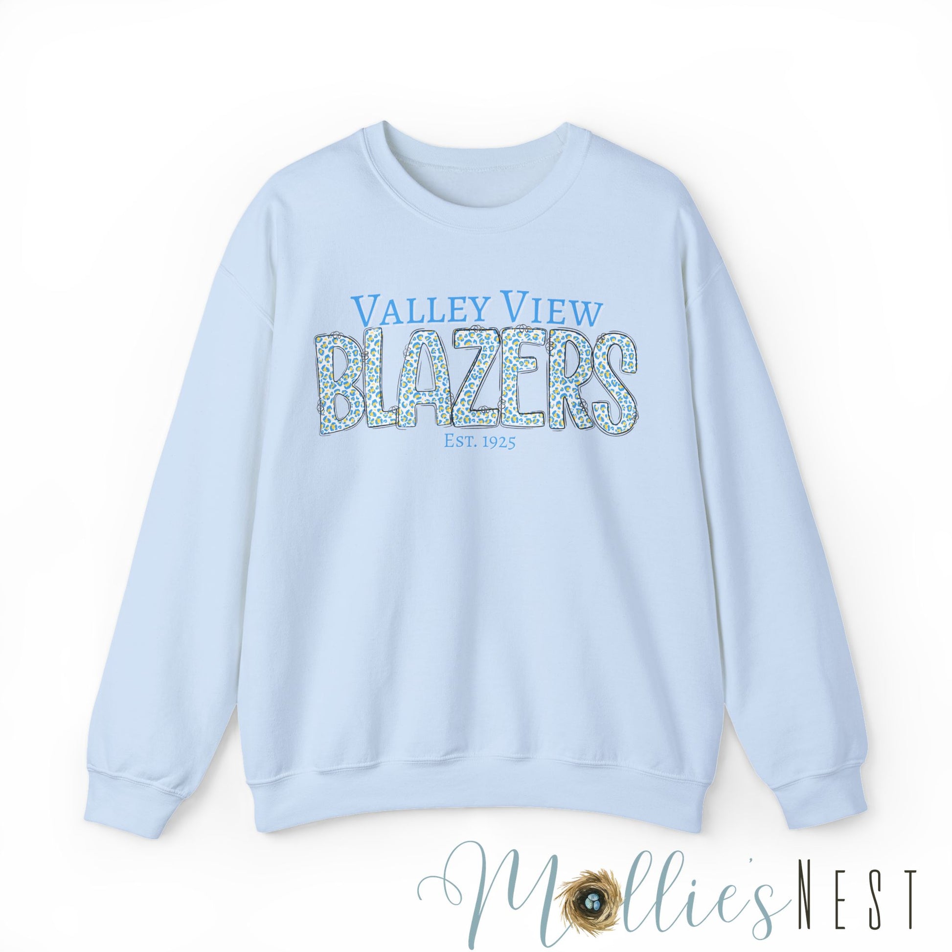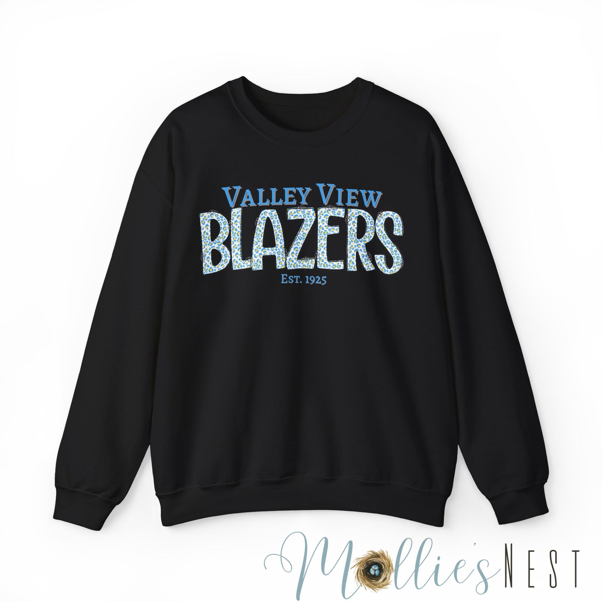 Valley View Blazers Crewneck Sweatshirt. Classic Blue Leopard